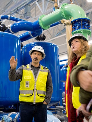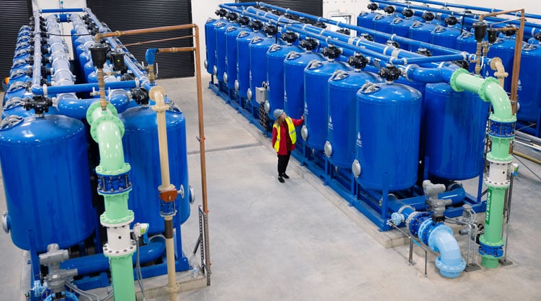 Above: The Cascade Water Treatment Plant uses a high-tech filtration system, including 120 blue pressure vessels that filter drinking water.